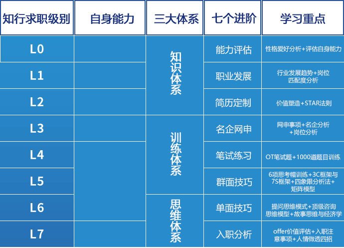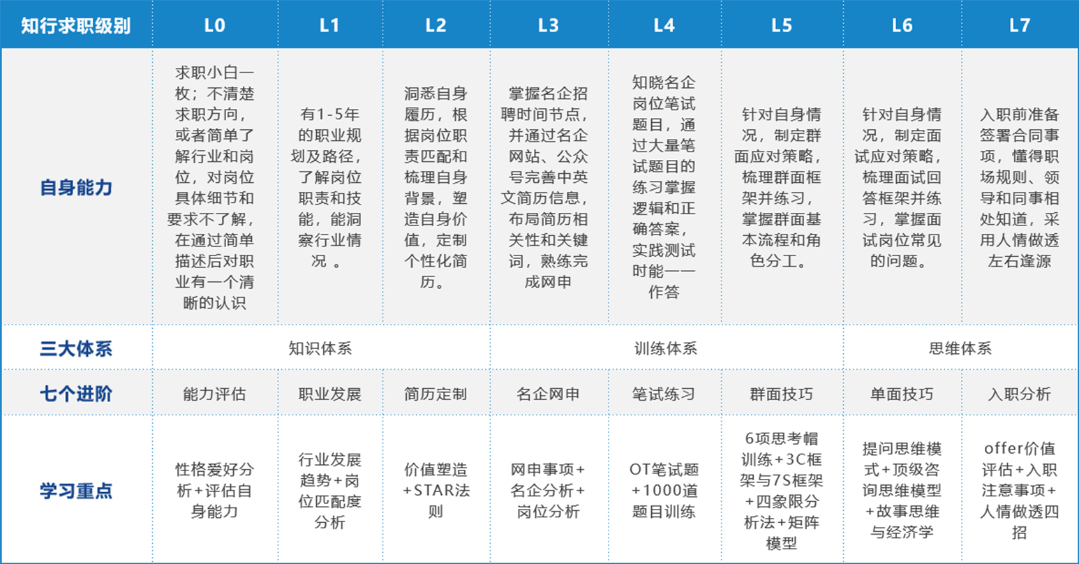 知行公社进阶体系,从入门级到专家级共7个进阶,完整对标职业规划、简历定制,网申、笔试、群面、单面等帮助学员清晰定位自己的职业水平,量化求职进程。